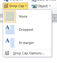 2.On the Insert tab, in the Text group, click Drop Cap.